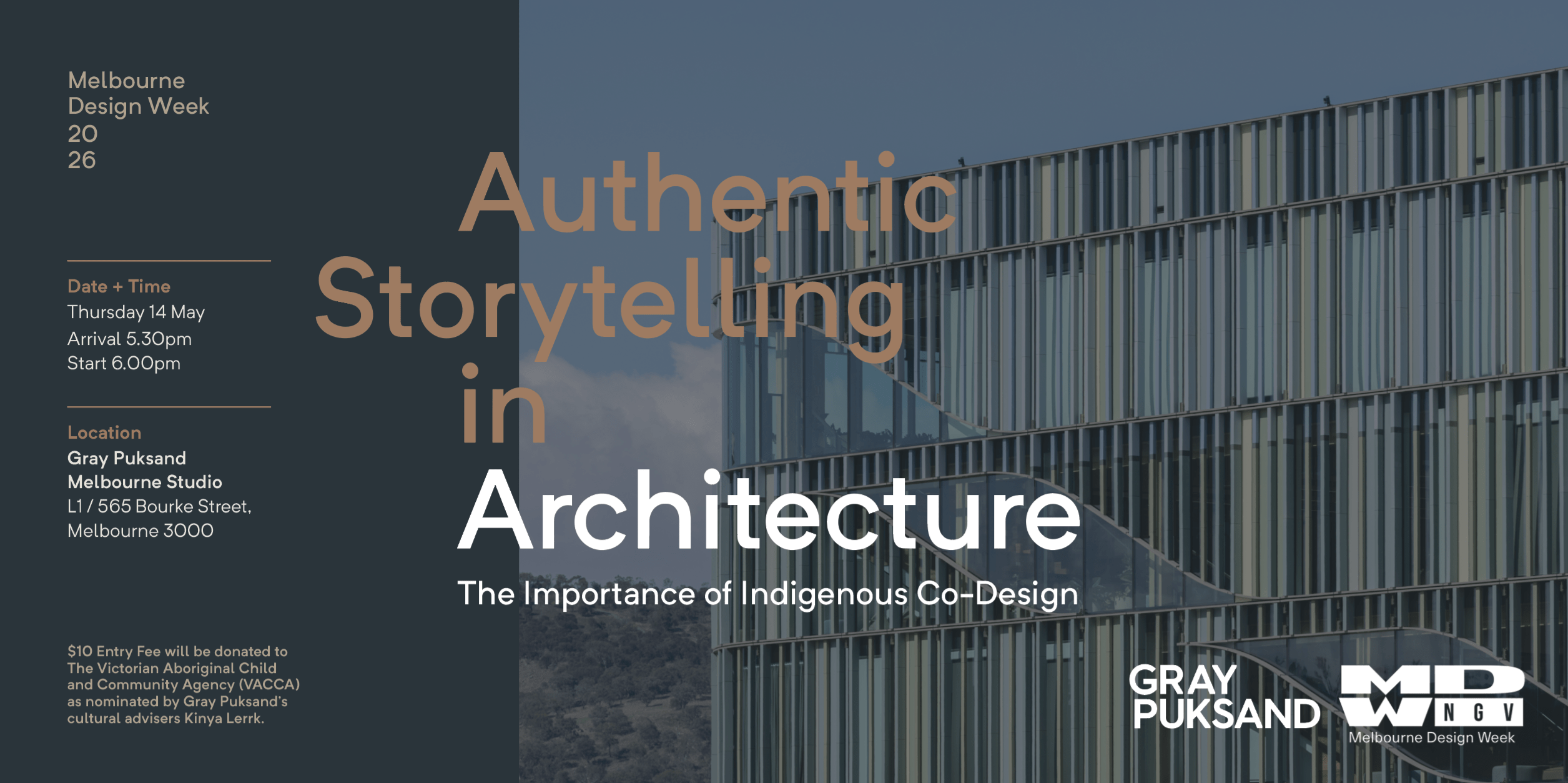 For Melbourne Design Week, Gray Puksand has invited Brad Buller, PhD Historian, Jeff Gray, Indigenous Engagement Lead, Uncle Dave Wandin, Wurundjeri Woi-wurrung Elder, Ian Khoo, Senior Associate Gray Puksand and moderated by Heidi Smith, Lead Partner (Vic) at Gray Puksand to analyze these layers and explore how deep engagement can occur, and how we can use design to embed these layers into projects. We will describe the extensive collaborative approach between architect, consultant and client, as we explore several case studies and their outcomes. We invite you to register your attendance to listen to the discussion for Melbourne Design Week at the Gray Puksand Melbourne Studio 5:30pm Thursday 14 May. All tickets sold include a donation to The Victorian Aboriginal Child and Community Agency.