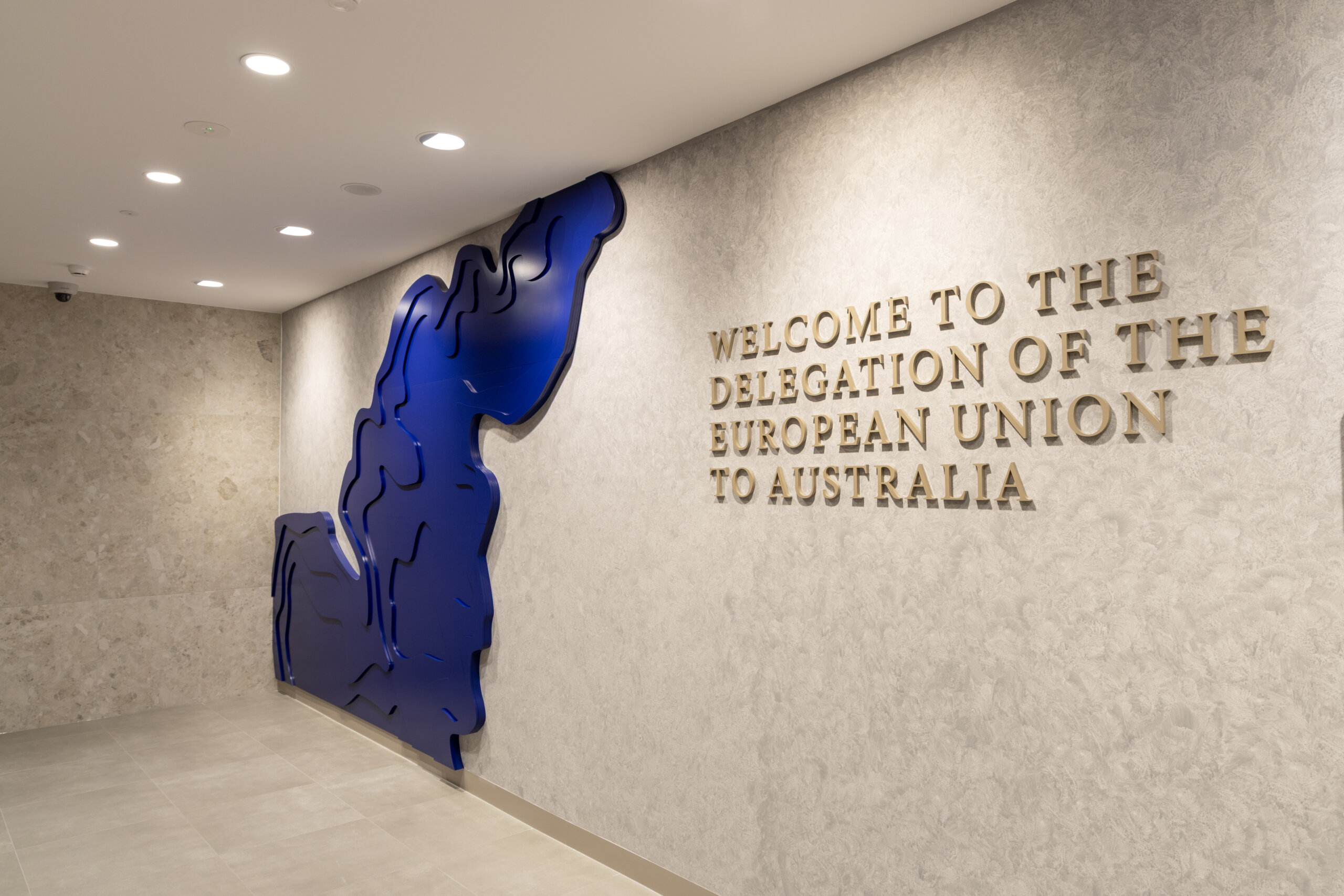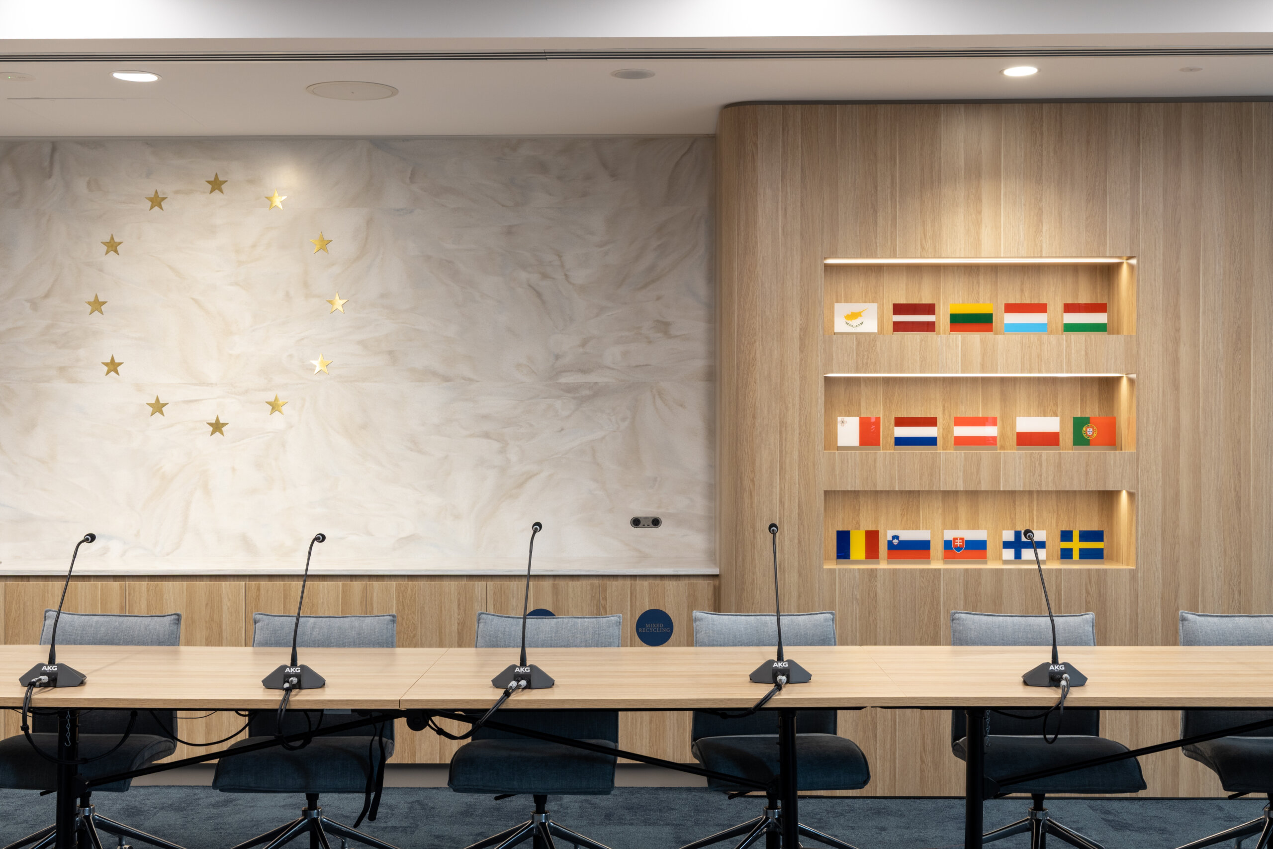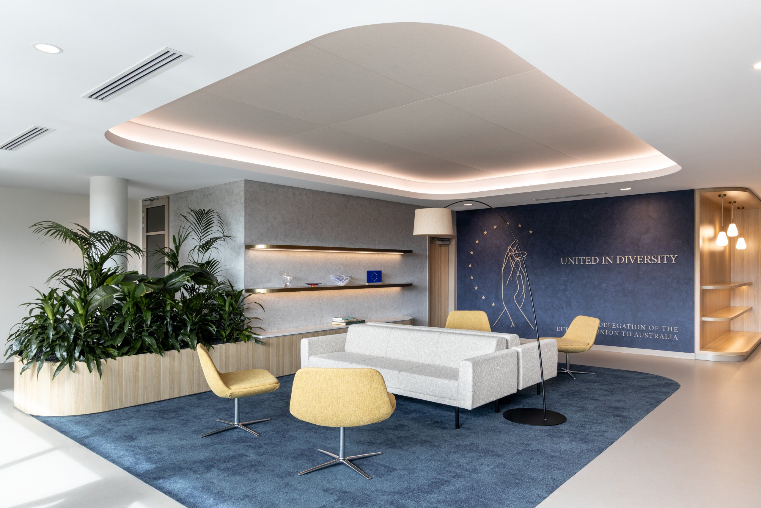 Security remains paramount, with the design adhering to EU technical standards and the European External Action Service (EEAS) security policy. A single, high-security entrance—built to Zone 4 security standards—ensures controlled access. Upon arrival, visitors are welcomed into a refined reception and waiting area before accessing key spaces, including private offices for the Head of Delegation and a state-of-the-art, audio-secure conference room accommodating up to 40 delegates.