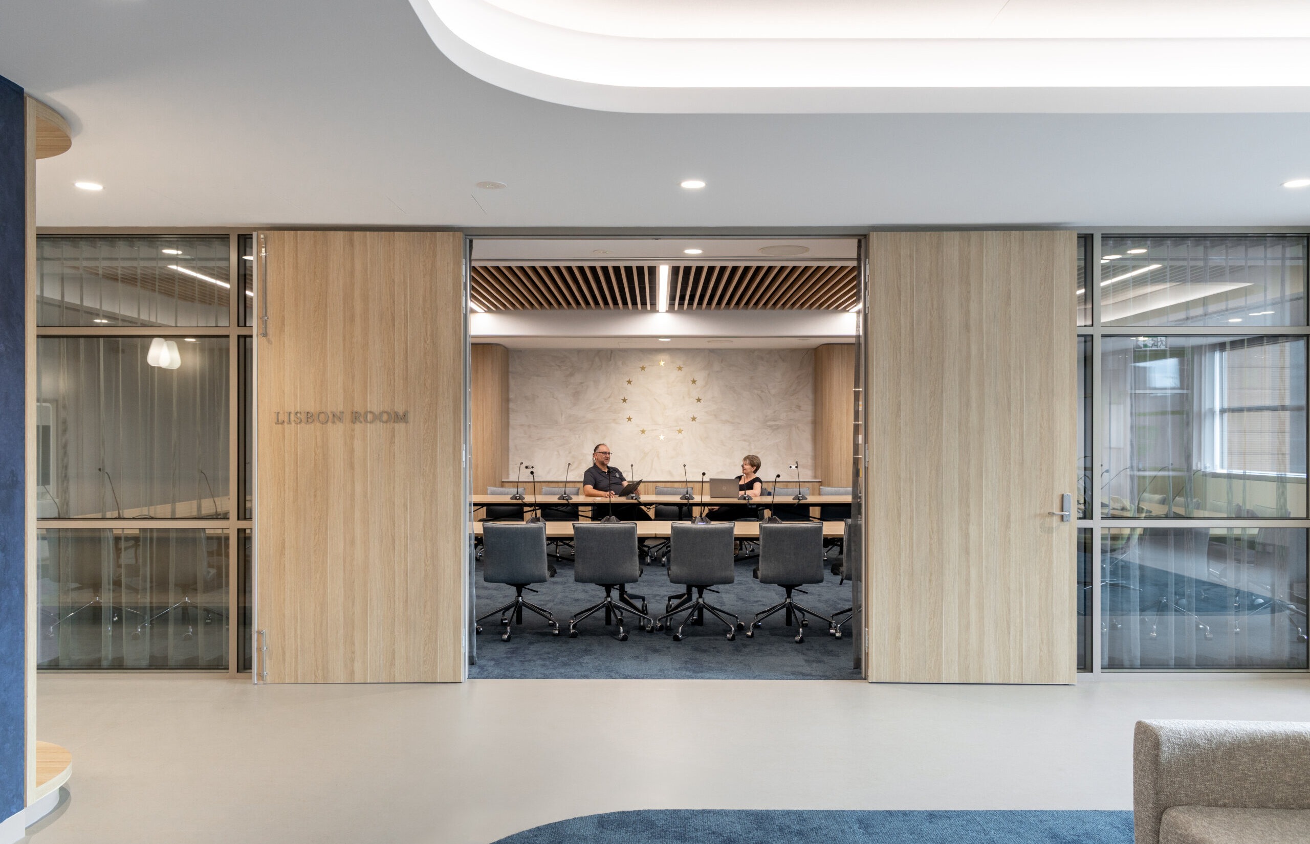 Sustainability is at the core of the design, reflecting the EU’s deep-rooted dedication to environmental stewardship and cultural diversity. This ethos ensures a vibrant, inclusive, and forward-thinking workplace. The building’s perimeter has been strategically utilised to flood the workspace with natural light, enhancing energy efficiency and promoting an uplifting atmosphere. Staff benefit from a seamless connection to the external environment, reinforcing a sense of openness and engagement with nature.