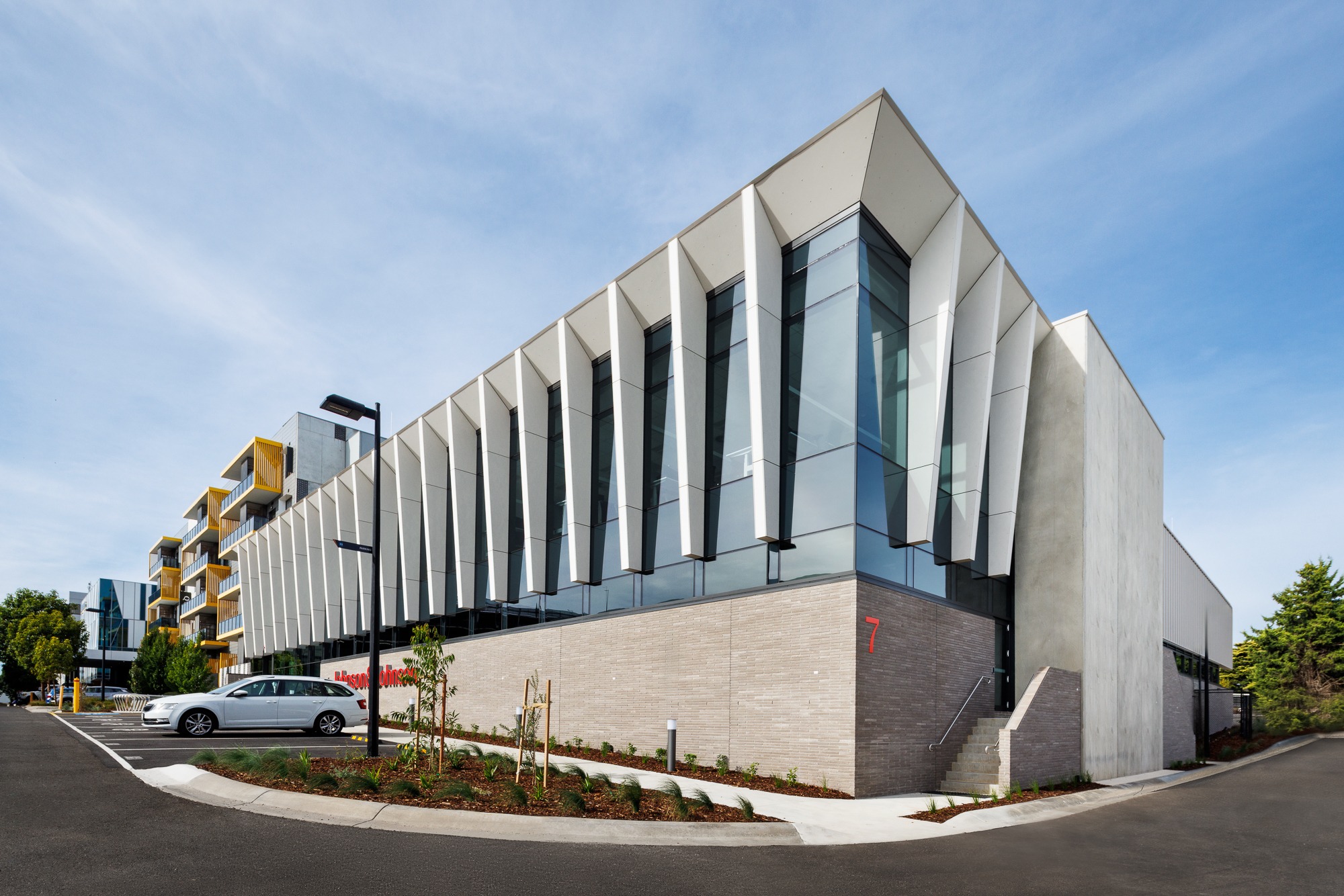 There is a long term vision at Ferntree Business Park to create a pedestrian focused green spine with a university campus like setting providing a host of outdoor spaces. Extensive landscaping, seating and bbq areas to invite users into the space and static exercise equipment to facilitate and active and healthy lifestyle. Working closely with J+J this approach to wellness has been continued into their new MedTech facility. The building considers passive solar design with its orientation and sun shading elements, whilst the interior has the wellness of its occupant as a priority.